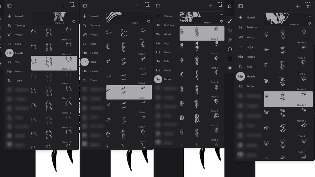 Monster Brush Set is a set of stamps that you can use to quickly create monsters and creatures. The main idea of the set is that it provides everything you need to quickly come up with a monster idea, without having to go through all possible stamp options for hours. For quick sketching, a limited number of options is better than a folder with over 250 stamps. All folders contain such a number of brushes, so that you don't have to scroll endlessly.