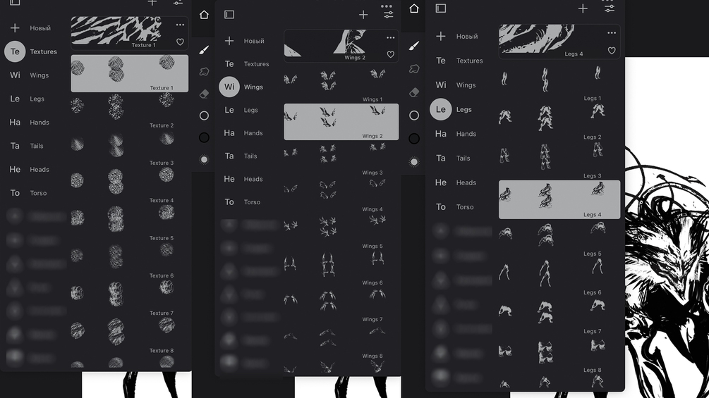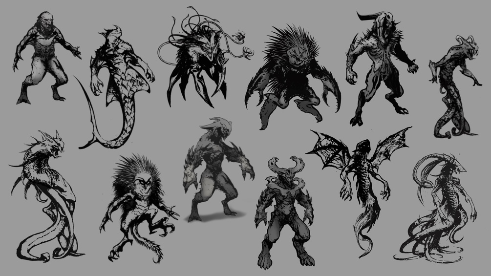 Monster Brush Set is a set of stamps that you can use to quickly create monsters and creatures. The main idea of the set is that it provides everything you need to quickly come up with a monster idea, without having to go through all possible stamp options for hours. For quick sketching, a limited number of options is better than a folder with over 250 stamps. All folders contain such a number of brushes, so that you don't have to scroll endlessly.